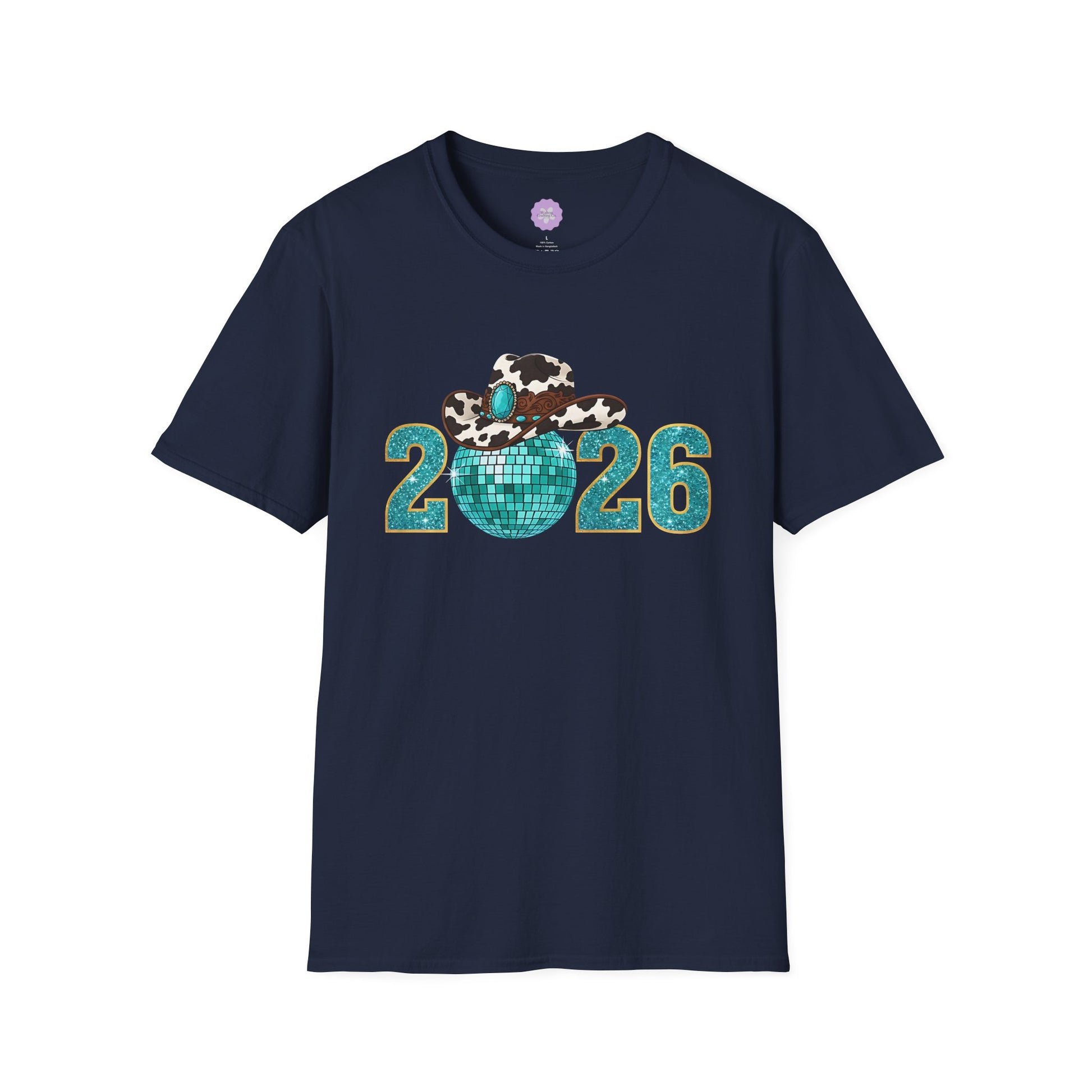 Ring in the New Year with western flair and a little sparkle. This unisex t-shirt features a bold “2026” design with a turquoise disco ball topped with a cow-print cowboy hat, making it perfect for New Year’s Eve celebrations, parties, or casual winter wear. Comfortable and easy to style, it’s a fun way to welcome 2026.