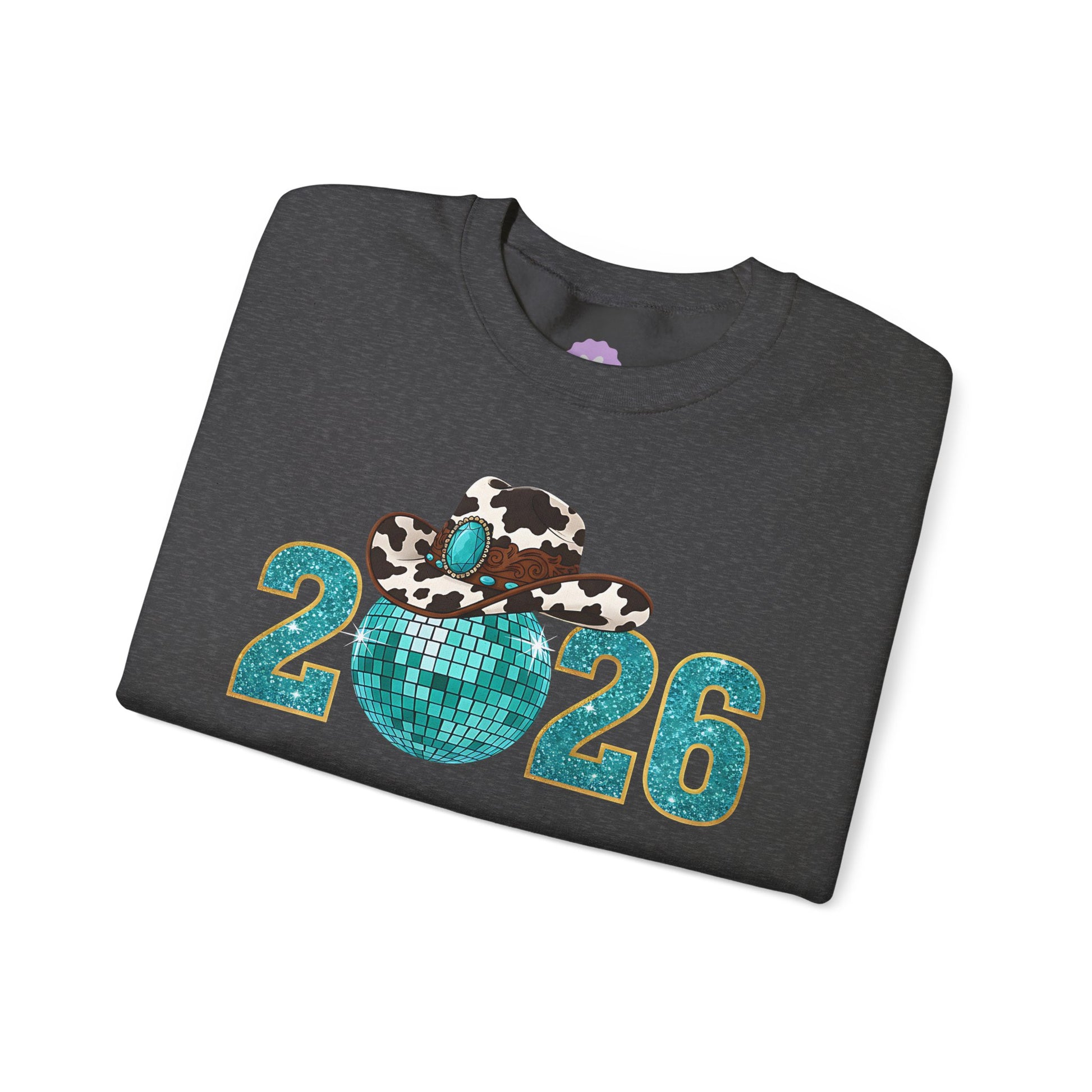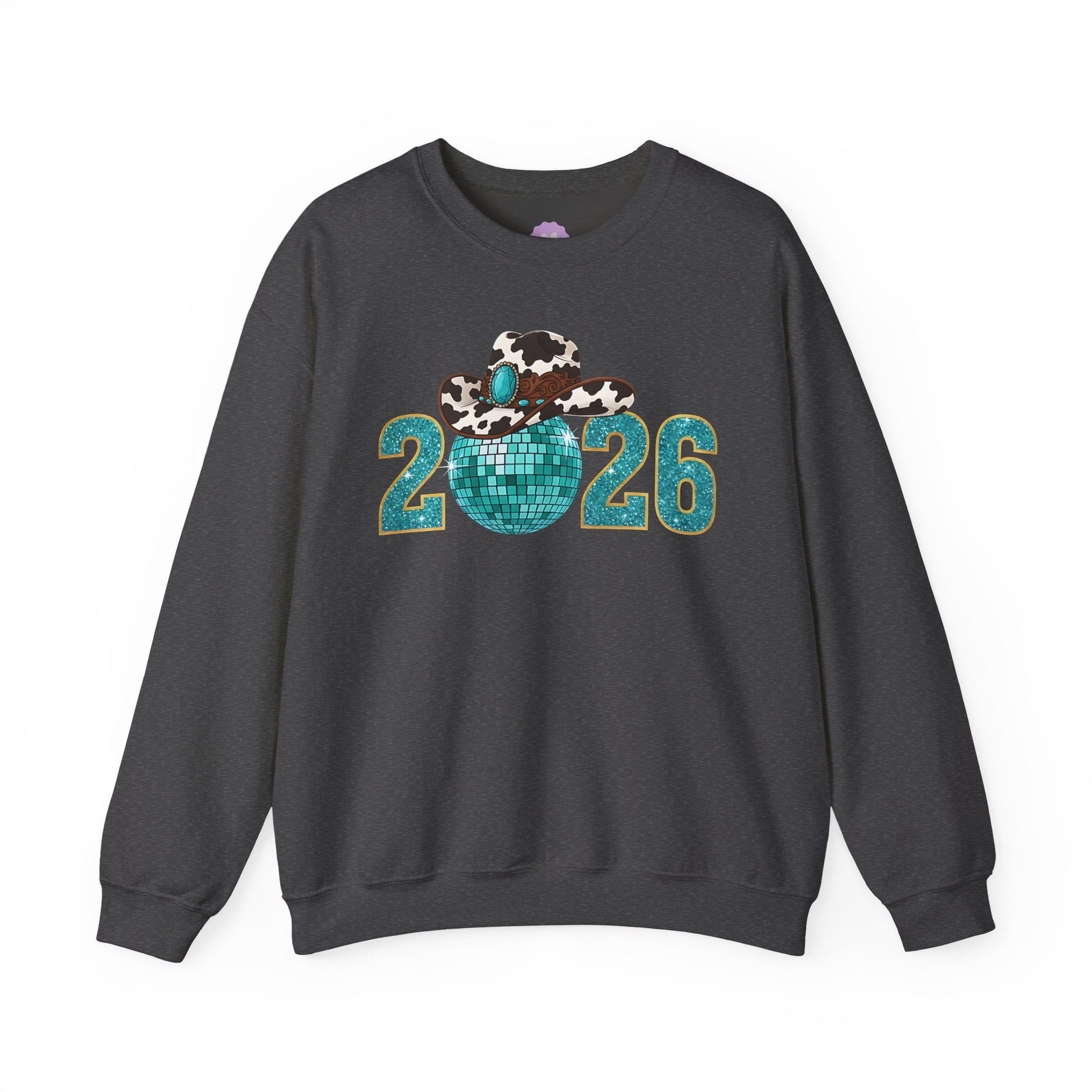 Start the New Year in standout style. This unisex crewneck sweatshirt features a bold “2026” design with a turquoise disco ball and cow-print cowboy hat for the perfect mix of western charm and New Year sparkle. Cozy, fun, and easy to wear, it’s perfect for New Year’s Eve celebrations, winter events, or welcoming 2026 in comfort.