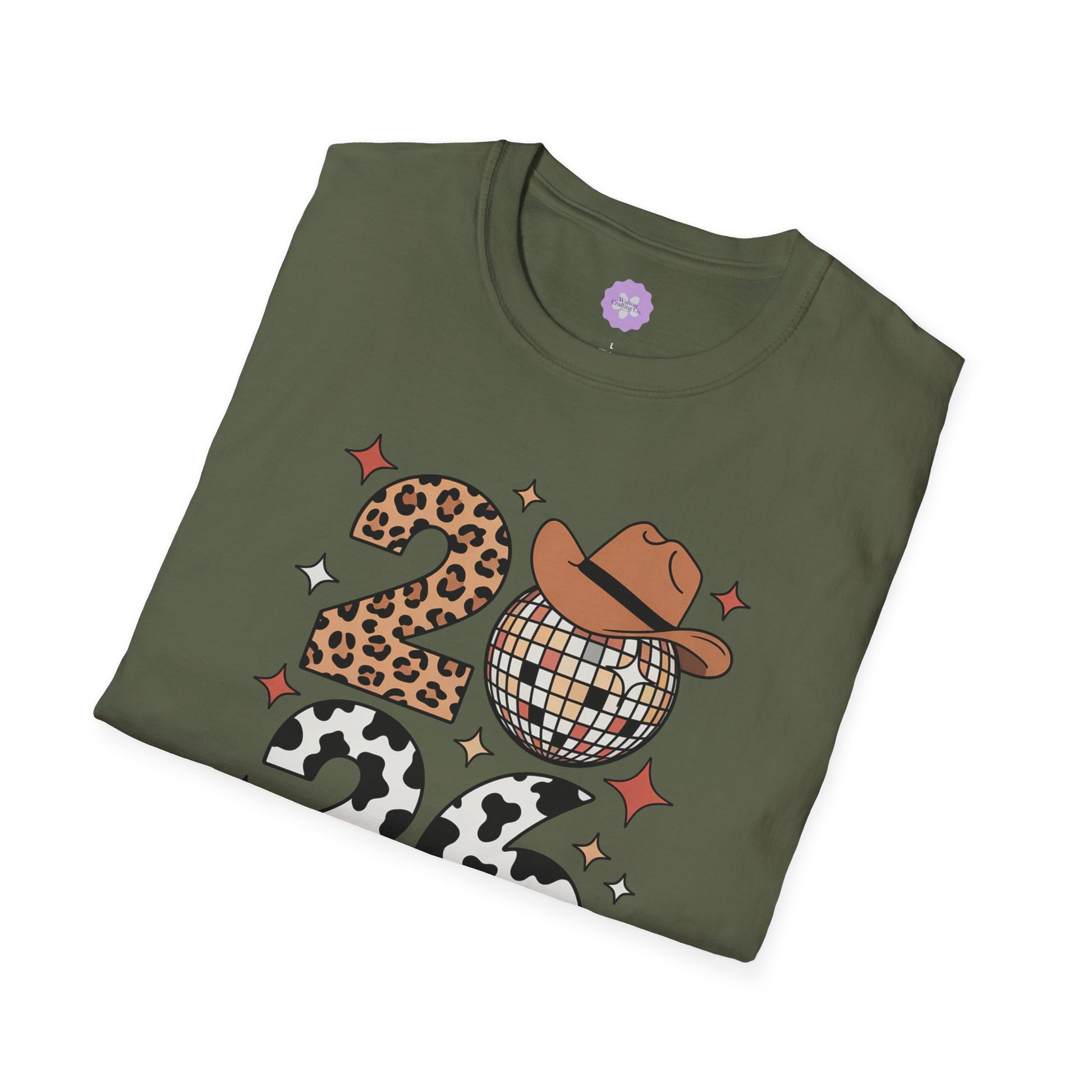 Celebrate the New Year in effortless style. This unisex t-shirt features a bold “2026 Happy New Year” design with western-inspired details, including a disco ball and cowboy hat for a fun, festive look. Lightweight and comfortable, it’s perfect for New Year’s Eve celebrations, casual outings, or welcoming 2026 in style.