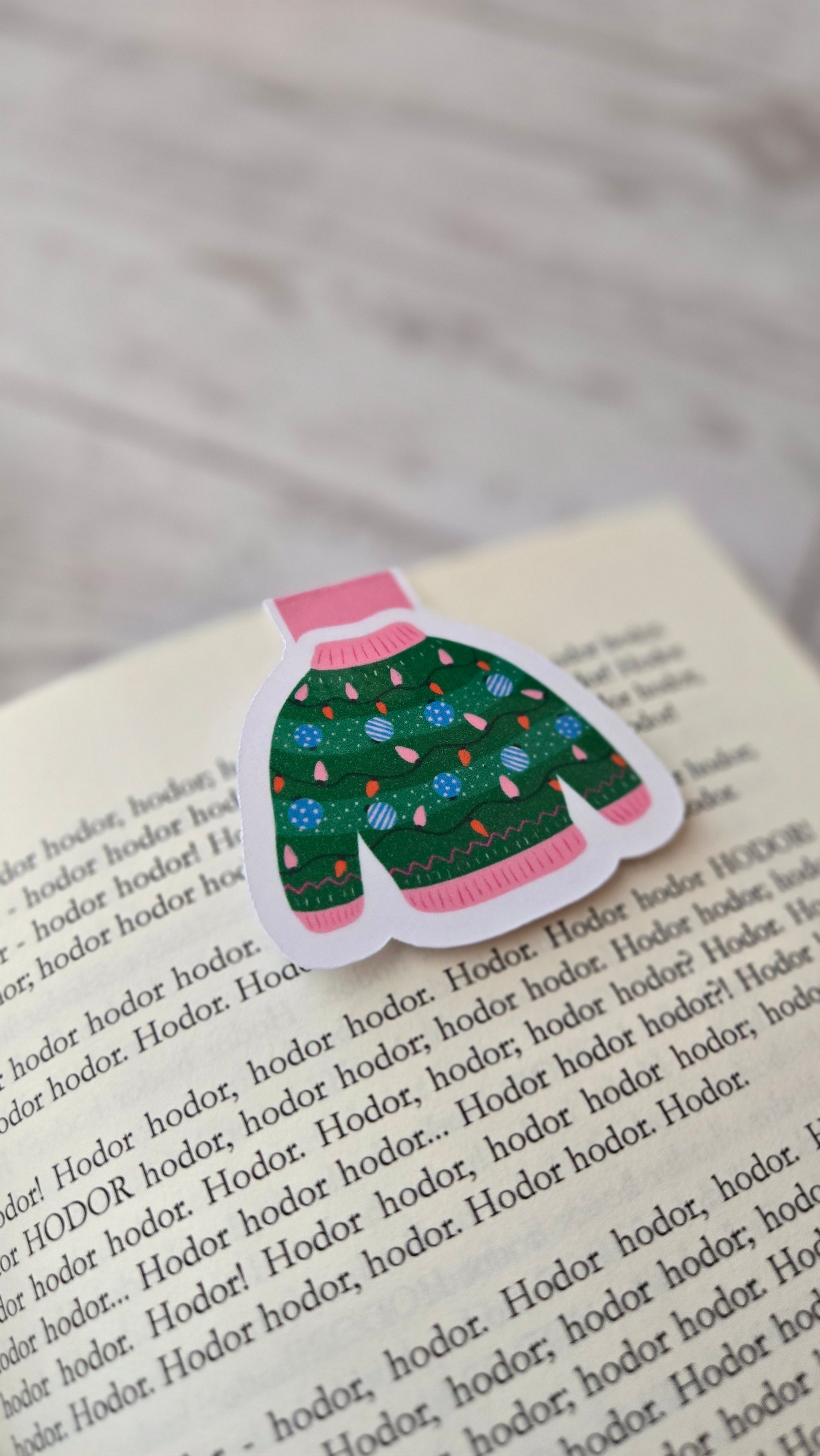 Cozy up your current read with this festive Green Christmas Lights Sweater magnetic bookmark! Featuring a cheerful green holiday sweater wrapped in twinkling Christmas lights and colorful ornaments, this bookmark brings the perfect pop of holiday cheer to every page.