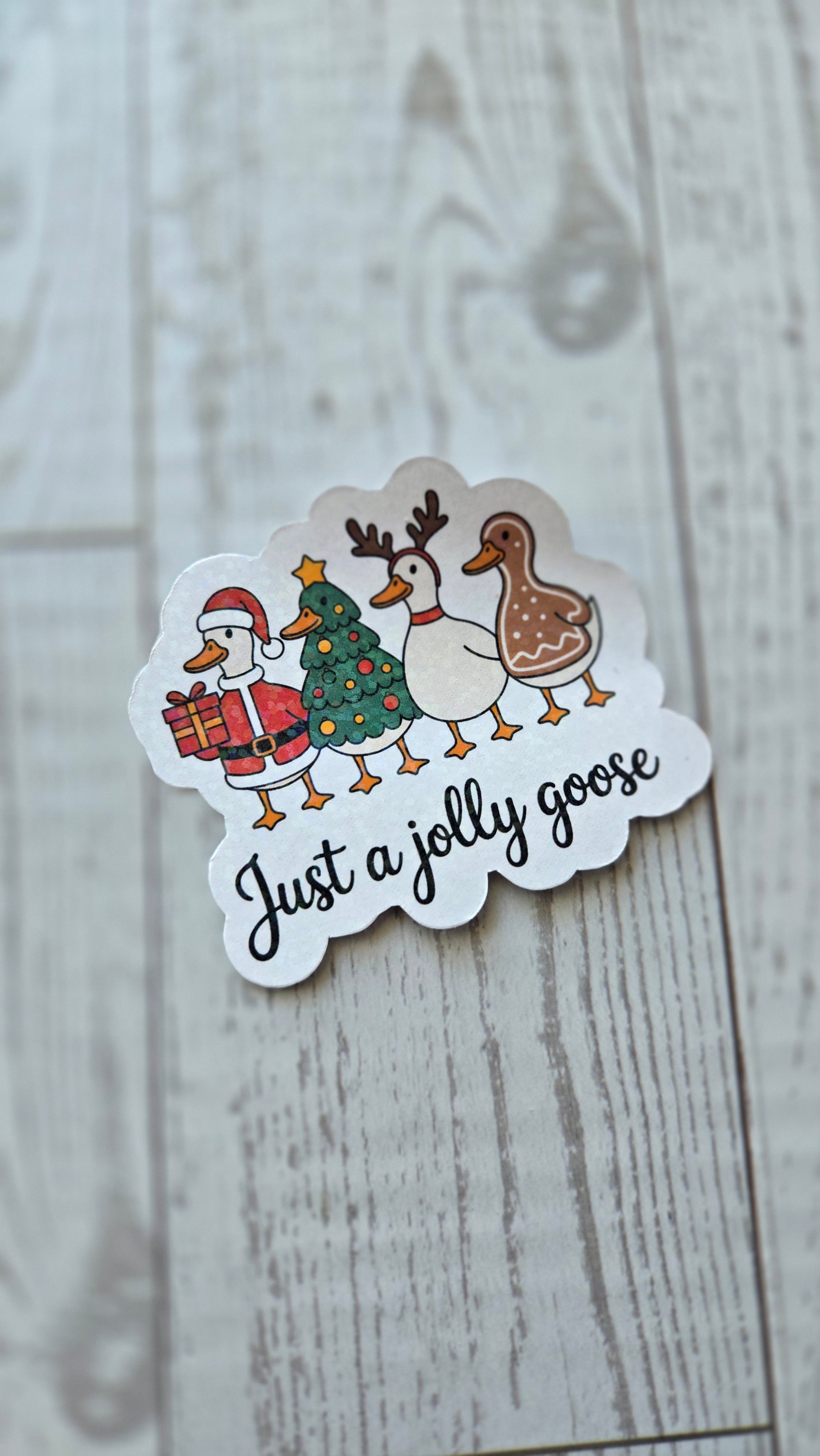 This Just a Jolly Goose sticker features a lineup of festive geese dressed as Santa, a Christmas tree, a reindeer, and a gingerbread cookie — the funniest little holiday parade you didn’t know you needed. Perfect for anyone who loves a cozy mix of cute and silly Christmas vibes.