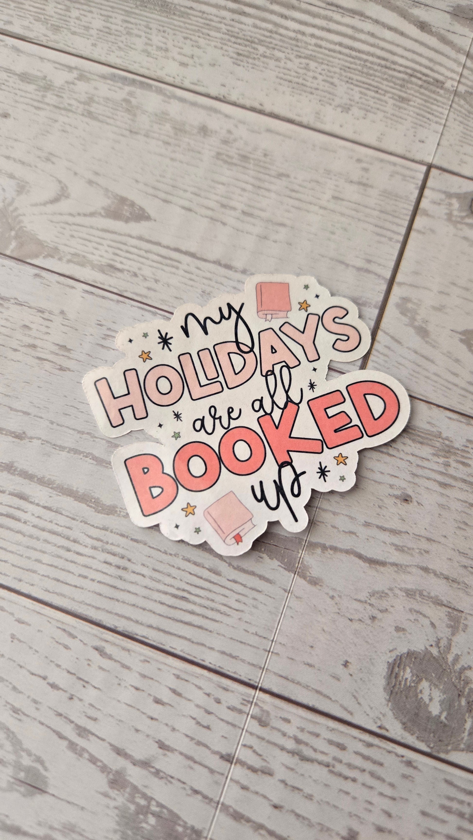This sticker features the phrase “My Holidays Are All Booked Up” with soft pink tones and book-themed details. Perfect for readers, teachers, librarians, and anyone who would rather spend the holidays with a good book.