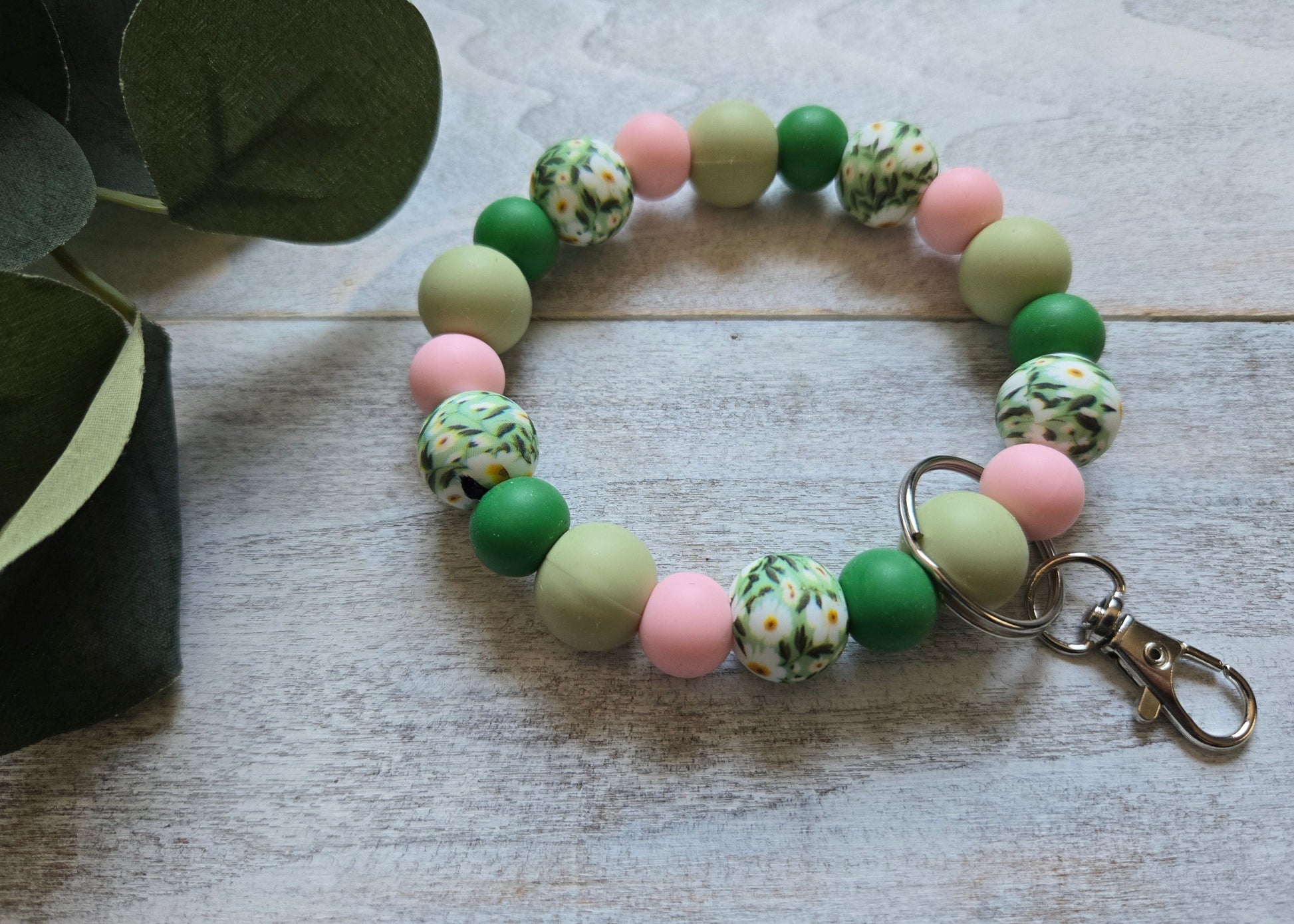 Bring a touch of springtime charm to your everyday routine with the Daisy Meadow Beaded Keychain Bracelet. Featuring soft blush pinks, sage and forest greens, and daisy-accented floral beads, this fresh design is the perfect mix of cheerful and practical. Cute, durable, and easy to wear, it’s a must-have accessory for keeping your keys close in style.