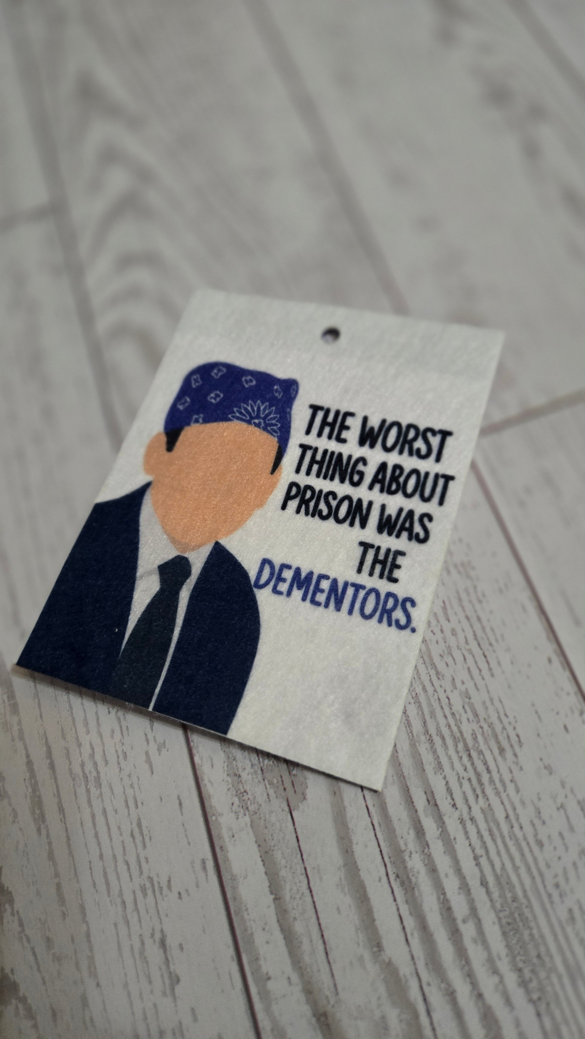 Bring peak Michael Scott chaos to your commute with this The Office–inspired hanging air freshie featuring the classic “The worst thing about prison was the dementors” quote.